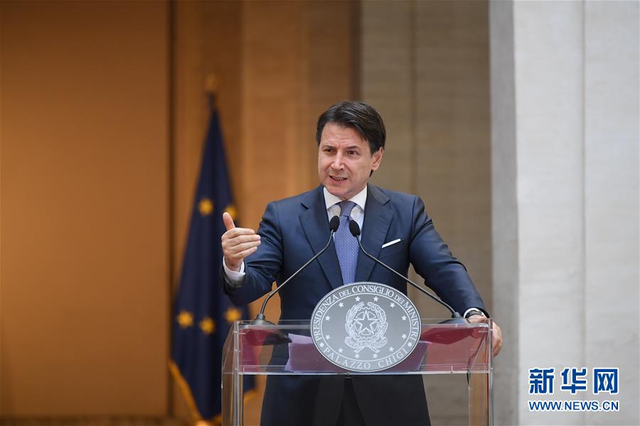 6月3日,在意大利首都罗马,意大利总理孔特在新闻发布会上讲话。 新华社发(阿尔贝托·林格利亚摄)