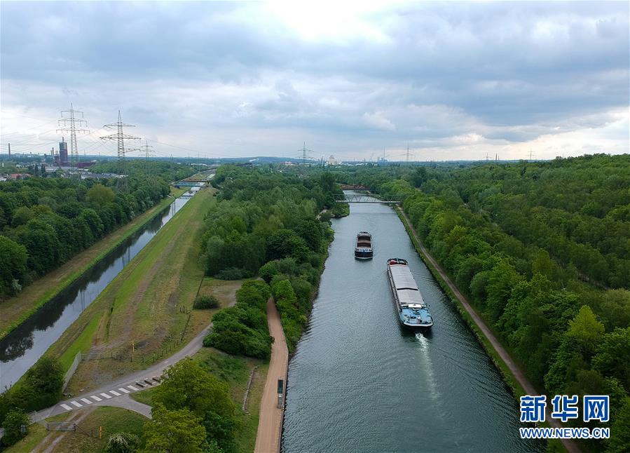 2019年5月10日,货船航行在德国埃森埃姆舍河上。埃森位于德国传统煤铁工业区——鲁尔区。鲁尔区经历了产业转型,已成为环境优美、高科技聚集的创新经济区。 6月5日是第47个联合国世界环境日,今年的主题为“关爱自然 刻不容缓”。 新华社记者 逯阳 摄