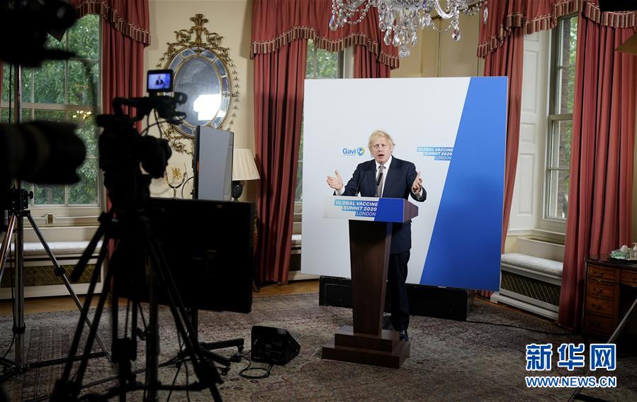 6月4日,在英国伦敦首相府,英国首相鲍里斯·约翰逊参加全球疫苗峰会视频会议并讲话。 新华社发(英国首相府供图)