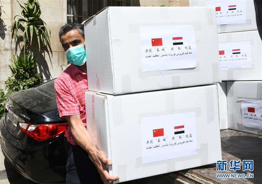 6月4日,在叙利亚首都大马士革,叙利亚卫生部工作人员搬运中国驻叙利亚大使馆捐赠的防疫物资。 新华社发(阿马尔·萨法尔贾拉尼摄)