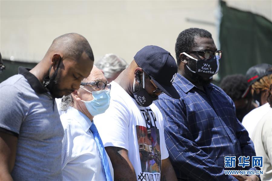 6月4日,特伦斯·弗洛伊德(右二)在美国纽约参加纪念兄弟乔治·弗洛伊德的集会。 当日,数千名纽约民众举行集会,纪念在警察暴力执法事件中死亡的非裔男子乔治·弗洛伊德。乔治·弗洛伊德的兄弟特伦斯·弗洛伊德及纽约市长德布拉西奥参加了集会。 新华社记者 王迎 摄