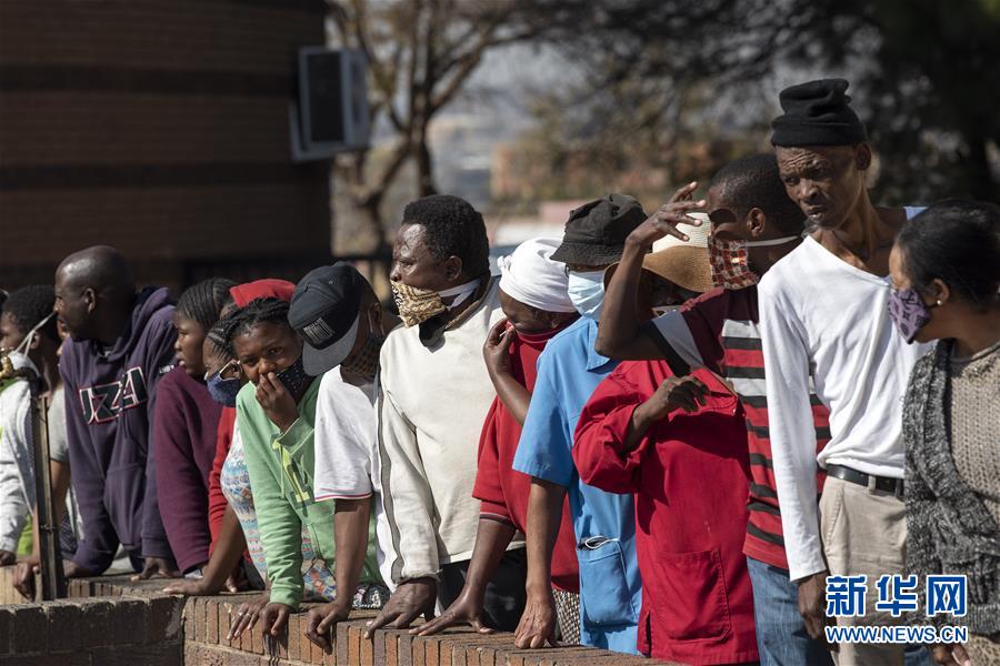 6月5日,在南非约翰内斯堡索韦托,市民排队领取食品。 当日,南非一些慈善组织为约翰内斯堡索韦托的部分贫困居民发放食物和防护用品。截至5日,南非累计报告新冠确诊病例40792例,累计死亡848例。 新华社记者 陈诚 摄