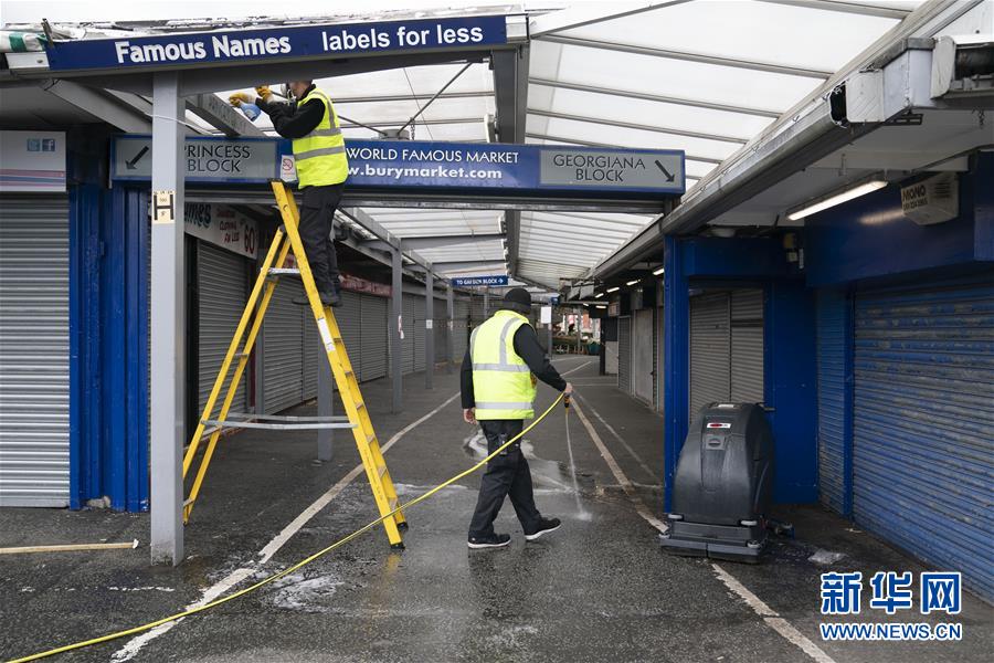 6月5日,工作人员在英国贝里的市场进行清洁。 英国卫生部6月5日发布的新冠疫情数据显示,该国的死亡病例数与前一天相比增加357例,累计达到40261例。 新华社发(乔恩·休珀摄)