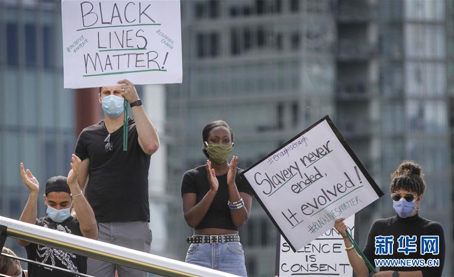 6月5日,抗议者手举“黑人的命也是命!”和“奴隶制从未被消灭,反而得到了进化!”等标语在加拿大温哥华参加示威活动。 因美国弗洛伊德事件引发的示威活动5日在加拿大温哥华举行,民众走上街头反对种族歧视,抗议在美国发生的针对非洲裔群体的种族歧视行为。 新华社发(梁森摄)