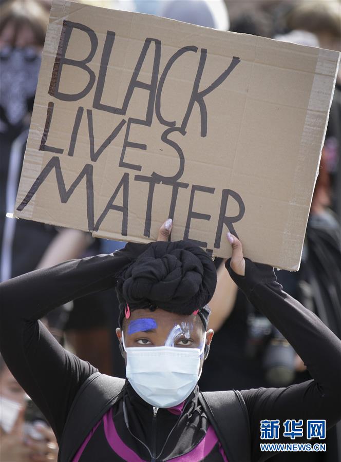 6月5日,一名抗议者手举“黑人的命也是命”的标语在加拿大温哥华参加示威活动。 因美国弗洛伊德事件引发的示威活动5日在加拿大温哥华举行,民众走上街头反对种族歧视,抗议在美国发生的针对非洲裔群体的种族歧视行为。 新华社发(梁森摄)