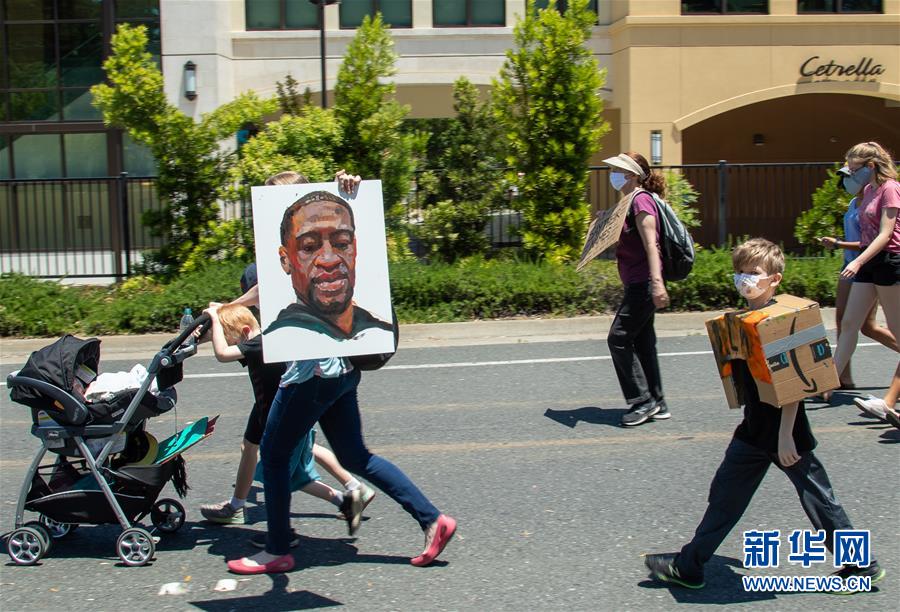 6月5日,人们在美国加利福尼亚州旧金山湾区洛斯阿尔托斯参加抗议活动。 美国因弗洛伊德事件引发的抗议示威活动5日进入第11天。当日,旧金山湾区民众继续走上街头抗议警察暴力执法和种族主义。 新华社发(董旭东摄)