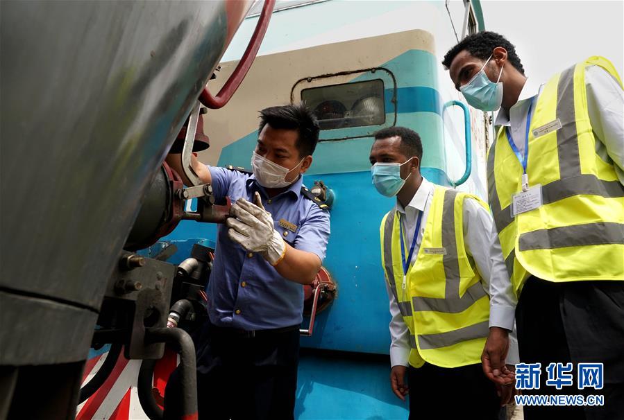 6月5日,带教司机在教伊迪内卡邱(中)和特瑞萨(右)进行机车检查作业。 新华社记者 李安 摄