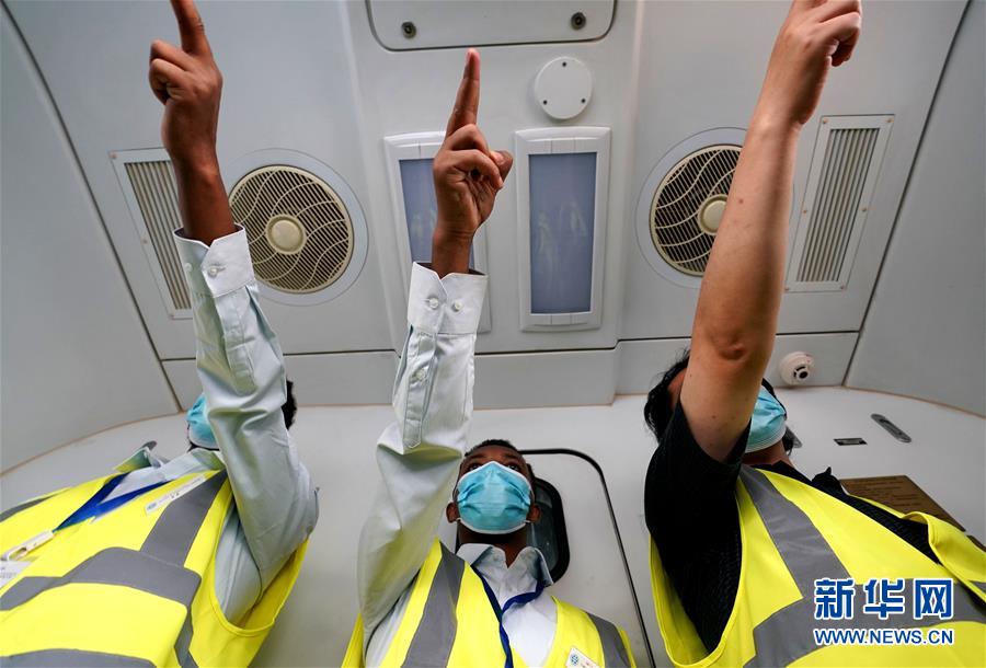 6月5日,实习指导教师带领伊迪内卡邱(中)和特瑞萨(左)练习标准化一次乘务作业。 新华社记者 李安 摄