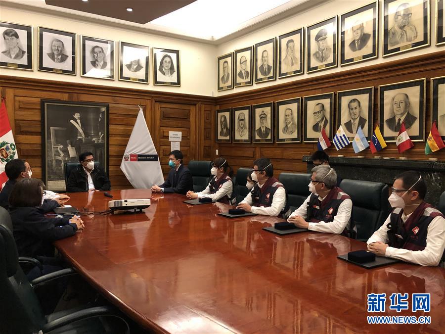 6月6日,在秘鲁首都利马卫生部总部,秘鲁部长会议主席(总理)塞瓦略斯(后中)看望中国专家组。 秘鲁卫生部长萨莫拉6日晚在首都利马代表秘鲁政府向中国抗疫医疗专家组4名成员颁发荣誉证书和奖章,以表彰他们为秘鲁抗疫工作所做贡献。 新华社发 (中国驻秘鲁大使馆供图)