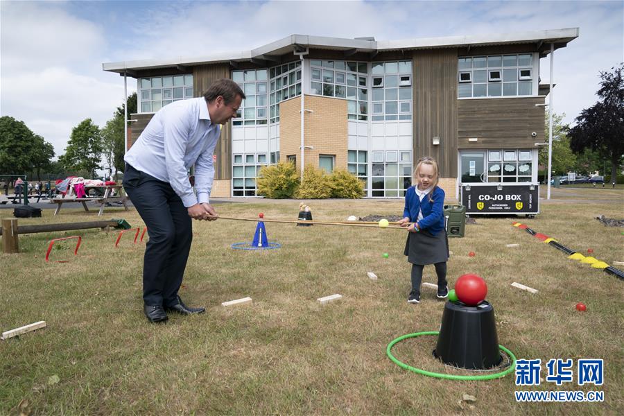 6月8日,在英国斯塔福德郡,兰迪伍德小学学前班的学生在校长安德鲁·克卢尔的帮助下用小棍子做保持安全距离相关游戏。新华社发(乔恩·休珀摄)