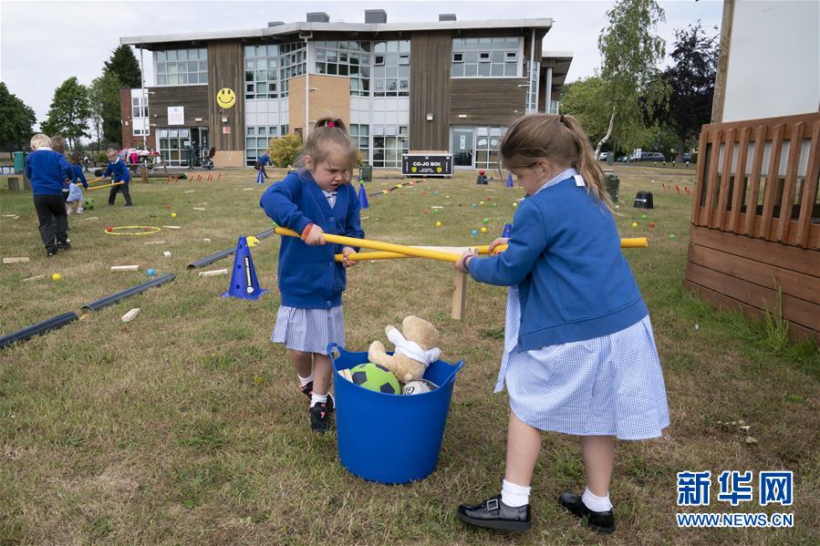 6月8日,在英国斯塔福德郡,兰迪伍德小学学前班的学生们用小棍子做保持安全距离相关游戏。新华社发(乔恩·休珀摄)