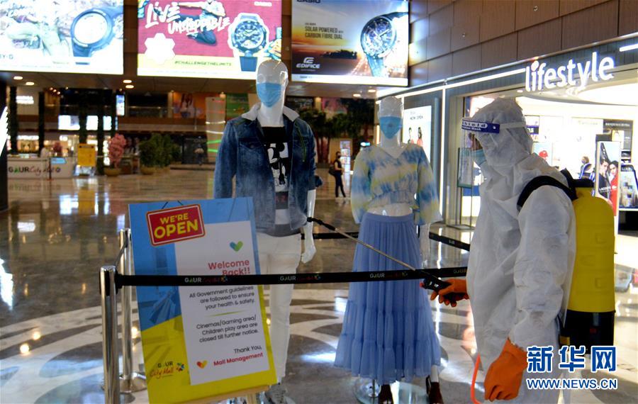 6月9日,工作人员在印度大诺伊达地区的商场内消毒。 印度中央政府从8日开始正式允许餐馆、购物中心和宗教场所对民众开放,这也是印度分阶段放松管控的第一步。 新华社发(帕塔·萨卡尔摄)