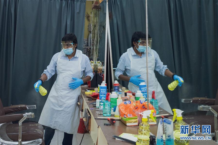 6月10日,理发师在马来西亚吉隆坡的理发店内为座椅消毒。 10日是马来西亚进一步放松相关防疫限制措施首日,不少民众赶到重新营业的理发店剪头发。 新华社记者 朱炜 摄