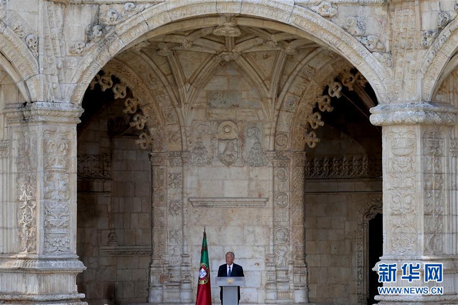 6月10日,葡萄牙总统德索萨在里斯本的庆祝活动现场发表讲话。 当日,葡萄牙举行国庆日庆祝活动。 新华社发(佩德罗·菲乌萨 摄)