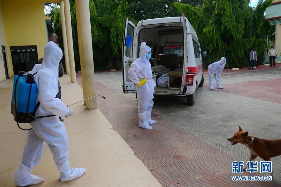 6月10日,医护人员在印度东北部特里普拉邦阿加尔塔拉的一处火葬场喷洒消毒剂。 新华社发
