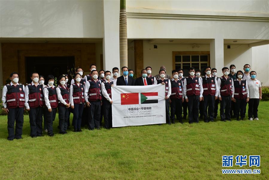6月10日,苏丹过渡政府总理哈姆杜克(中右)在位于喀土穆的总理府与中国医疗专家组成员合影。 苏丹过渡政府总理哈姆杜克10日表示,中国政府援苏丹抗疫医疗专家组分享宝贵经验,提出中肯建议,增强了苏丹抵御新冠疫情、维持经济社会正常运转的能力和信心。 新华社记者马意翀摄