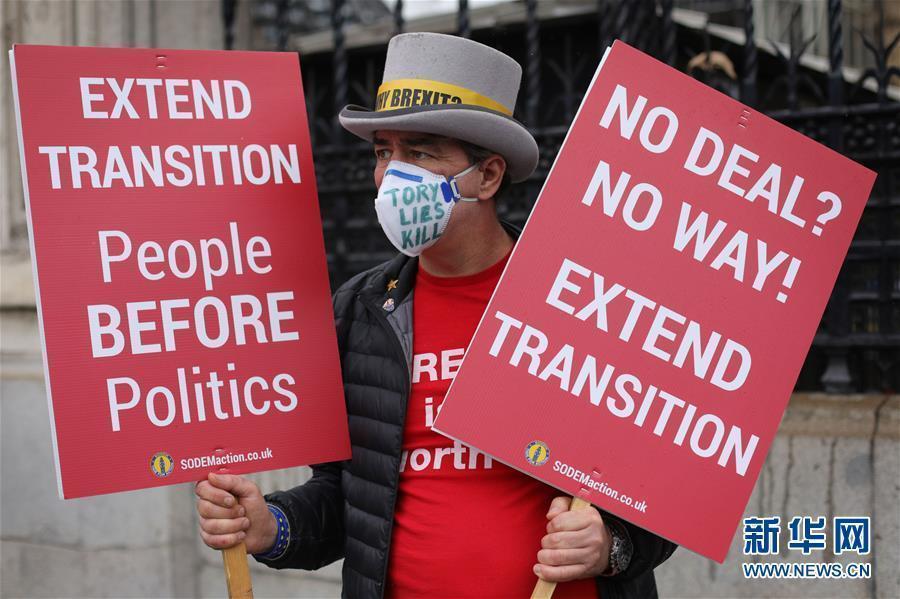 6月10日,无协议 “脱欧”反对者在英国伦敦议会大厦外手举标语牌。新华社发(蒂姆·爱尔兰摄)