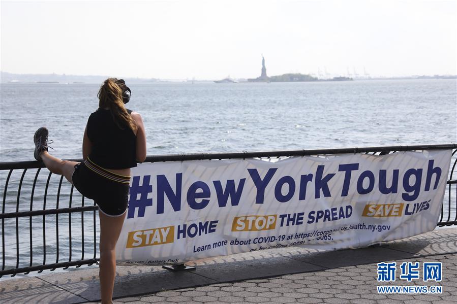 6月10日,一名女子在美国纽约一处公园内写有“纽约坚强”的横幅旁锻炼。 美国约翰斯·霍普金斯大学10日发布的新冠疫情最新统计数据显示,美国累计确诊病例超过200万例。 新华社记者 王迎 摄