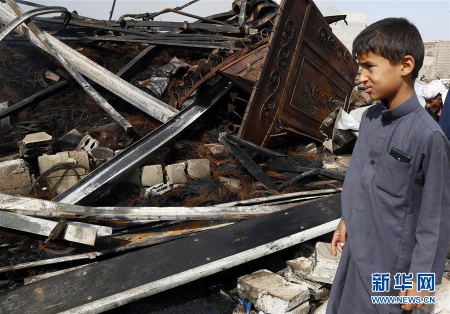 7月2月,一名男孩站在也门首都萨那一处遭空袭的仓库废墟旁。 据马西拉电视台1日报道,也门首都萨那当天多次遭战机空袭,胡塞武装称多国联军实施了空袭。 新华社发(穆罕默德摄)