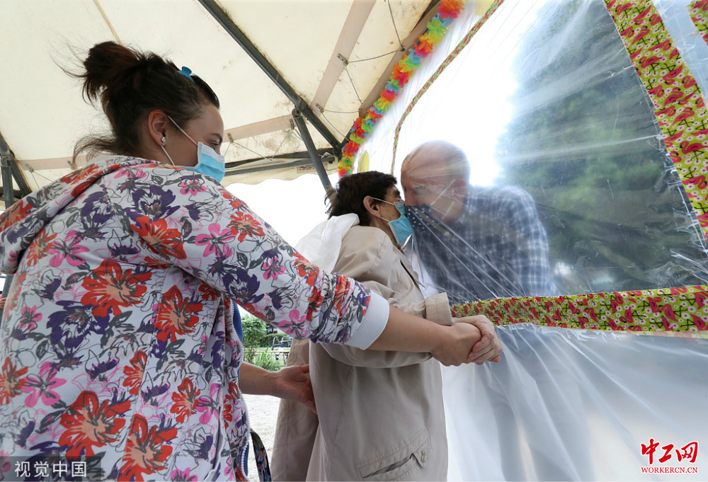画面温馨 比利时养老院老人隔“塑料墙”与亲人拥抱