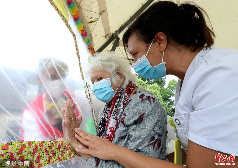 画面温馨 比利时养老院老人隔“塑料墙”与亲人拥抱
