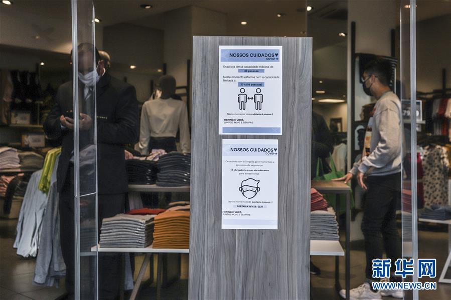 7月2日,巴西圣保罗州首府圣保罗市一家服装店门口张贴告示,提醒顾客佩戴口罩并保持社交距离。新华社发(拉赫尔·帕特拉索摄)