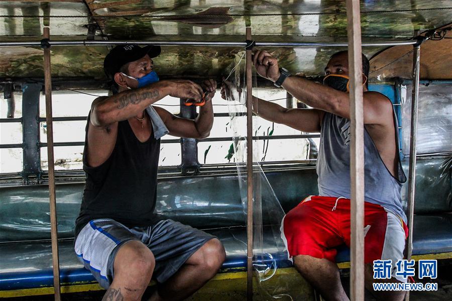 7月3日,菲律宾马尼拉的“吉普尼”公交车司机在座位间安装塑料膜。 菲律宾卫生部3日通报,截至当地时间3日16时,菲律宾累计新冠确诊病例已达40336例,过去24小时新增确诊病例1531例,这是该国自疫情暴发以来单日新增确诊病例数的新高。 新华社发(乌马利摄)