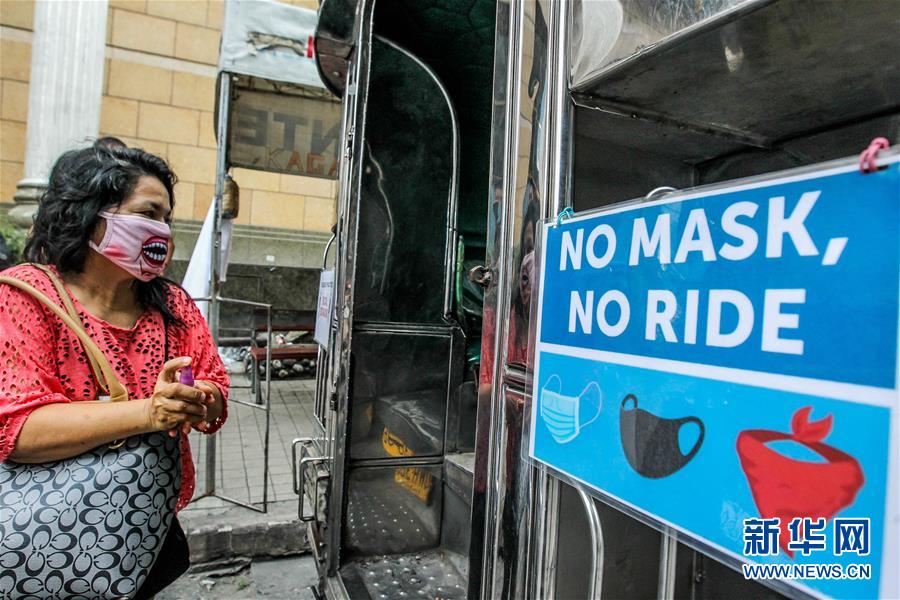 7月3日,一名女子在菲律宾马尼拉登上贴有“没有口罩不能登车”字样的“吉普尼”公交车。 菲律宾卫生部3日通报,截至当地时间3日16时,菲律宾累计新冠确诊病例已达40336例,过去24小时新增确诊病例1531例,这是该国自疫情暴发以来单日新增确诊病例数的新高。 新华社发(乌马利摄)
