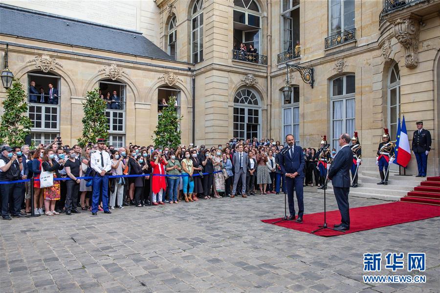 7月3日,在法国巴黎总理府,卸任总理爱德华·菲利普与新任总理让·卡斯泰出席权力交接仪式。 法国总统府爱丽舍宫3日发布公报说,总统马克龙任命让·卡斯泰为新总理,负责组建政府。 新华社发(奥雷利安·莫里萨尔摄)