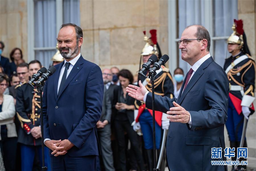 7月3日,在法国巴黎总理府,卸任总理爱德华·菲利普(前左)与新任总理让·卡斯泰(前右)出席权力交接仪式。 法国总统府爱丽舍宫3日发布公报说,总统马克龙任命让·卡斯泰为新总理,负责组建政府。 新华社发(奥雷利安·莫里萨尔摄)