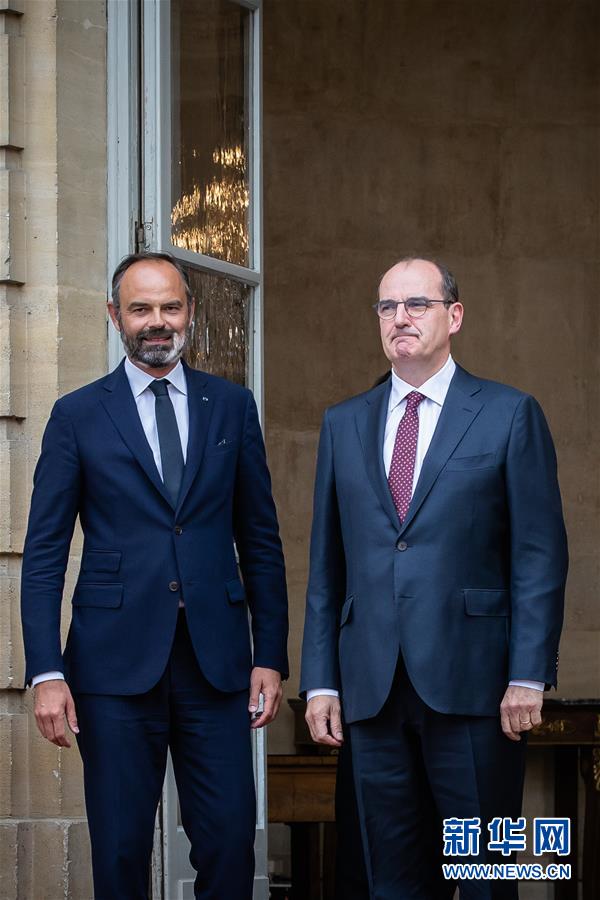 7月3日,在法国巴黎总理府,卸任总理爱德华·菲利普(左)与新任总理让·卡斯泰出席权力交接仪式。 法国总统府爱丽舍宫3日发布公报说,总统马克龙任命让·卡斯泰为新总理,负责组建政府。 新华社发(奥雷利安·莫里萨尔摄)