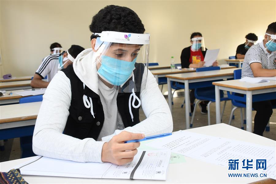 7月3日,在摩洛哥塞拉,一名学生戴着口罩和面罩参加大学入学考试。 新华社发(查迪摄)