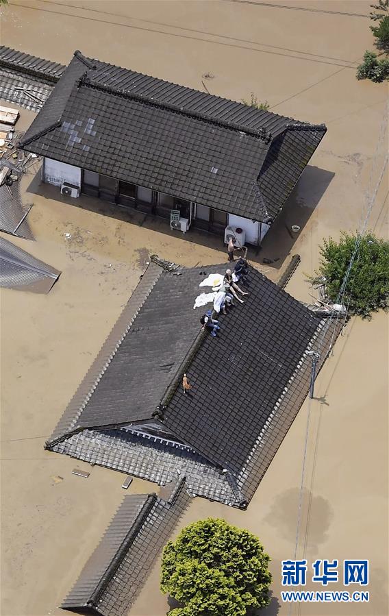 7月4日,在日本熊本县人吉市,受灾民众在房顶上等待救援(航拍照片)。新华社/共同社