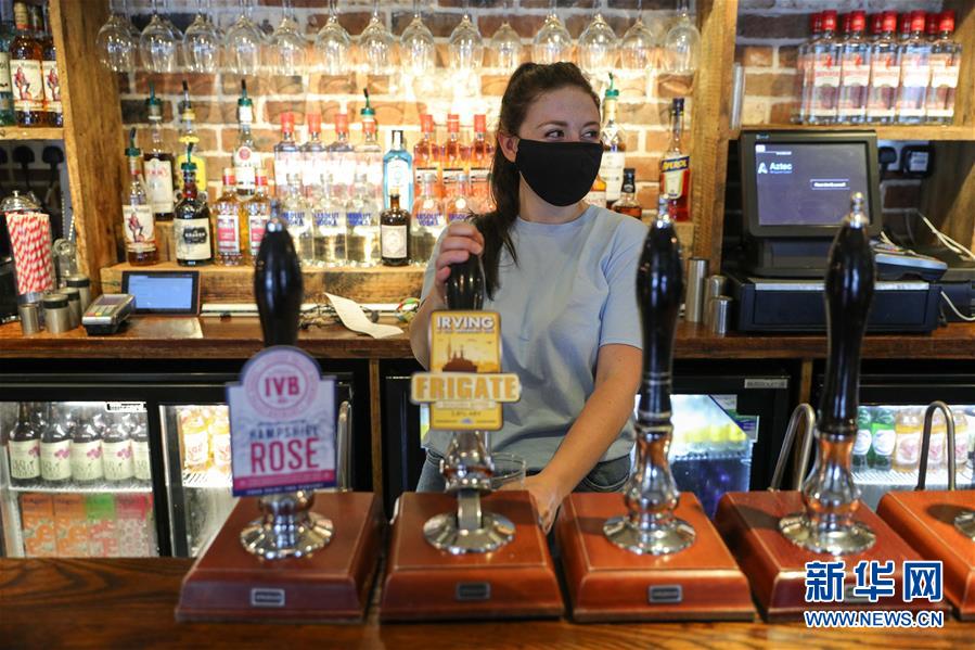 7月4日,英国温切斯特一家酒吧的工作人员在接啤酒。 根据英国政府公布的防控措施,7月4日起,酒吧、餐厅和理发店可以恢复营业,但必须严格遵守相关防控规定。英国媒体将这天称为“超级星期六”,商家早已做好准备,政府提醒民众遵守保持社交距离等规定,以免疫情反弹。 新华社发(蒂姆·爱尔兰摄)