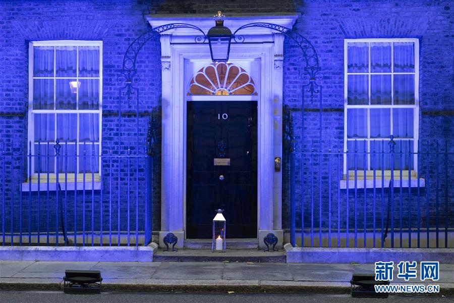 这是7月4日在英国伦敦拍摄的点亮蓝色灯光的唐宁街10号首相府。 当晚,伦敦一些地标建筑亮起蓝色灯光,祝贺7月5日到来的英国国民保健制度(NHS)建立72周年纪念日,并表示对抗击新冠疫情的医护人员的敬意。 新华社发(雷伊·唐摄)