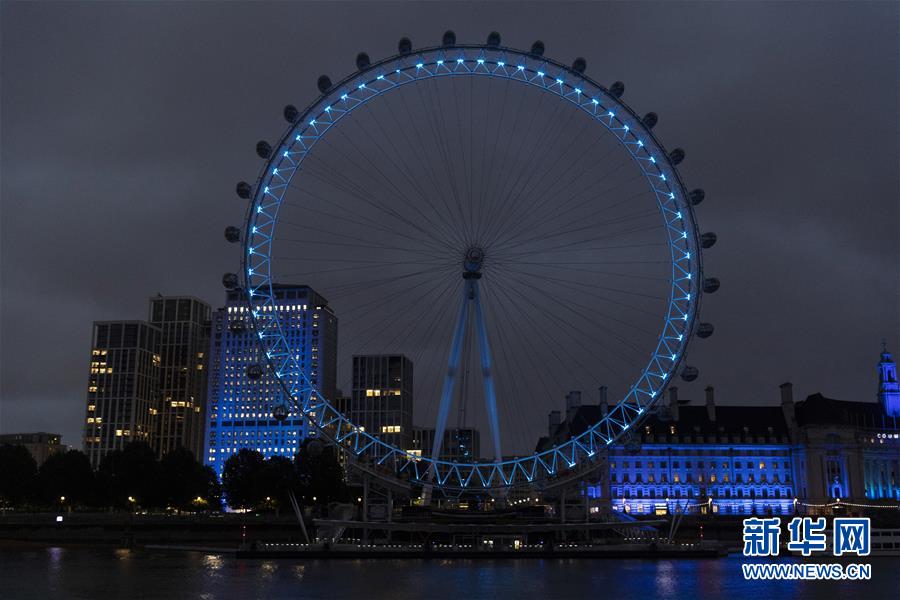 这是7月4日在英国伦敦拍摄的点亮蓝色灯光的“伦敦眼”。 当晚,伦敦一些地标建筑亮起蓝色灯光,祝贺7月5日到来的英国国民保健制度(NHS)建立72周年纪念日,并表示对抗击新冠疫情的医护人员的敬意。 新华社发(雷伊·唐摄)