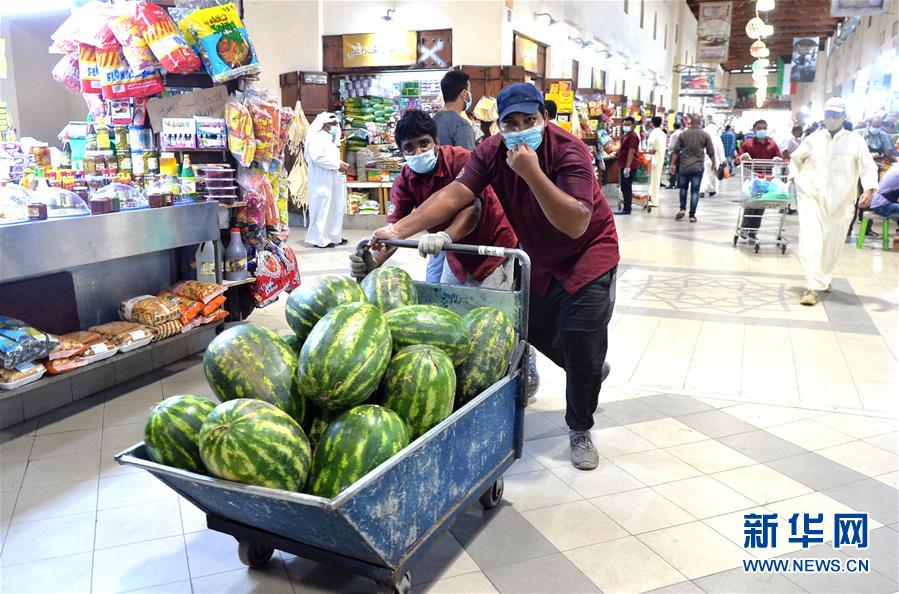 7月5日,商贩推着西瓜穿过科威特首都科威特城的穆巴拉克老市场。 科威特著名的穆巴拉克老市场近日客流回升。科威特从6月30日起进入复工复产第二阶段,政府部门和私营部门部分恢复工作,重新开放公园、银行、零售店等。 新华社发(阿萨德摄)