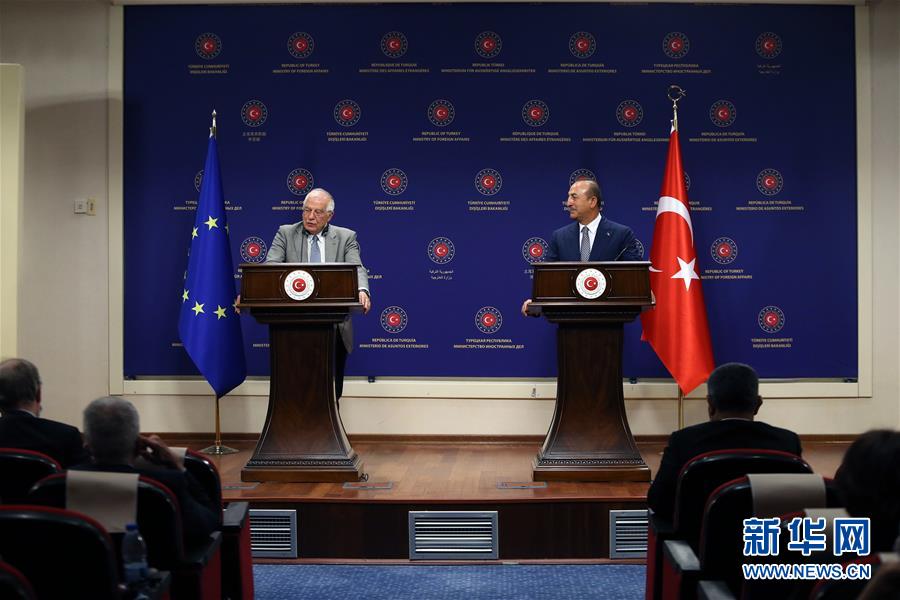 7月6日,在土耳其安卡拉,土耳其外交部长恰武什奥卢(右)与欧盟外交与安全政策高级代表博雷利出席联合记者会。 土耳其外交部长恰武什奥卢6日表示,如果欧盟因东地中海地区分歧而决定对土耳其实施新制裁,土耳其将采取反制措施。 新华社发