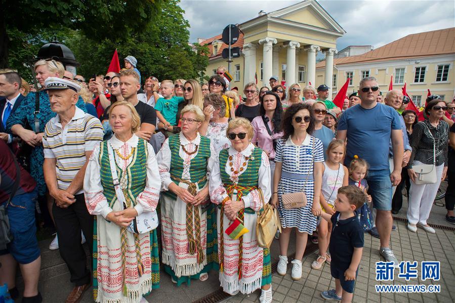 7月6日,在立陶宛维尔纽斯,人们参加“建国日”纪念活动。 当天,立陶宛举行活动庆祝“建国日”。 新华社发(阿尔弗雷达斯·普里亚迪斯 摄)