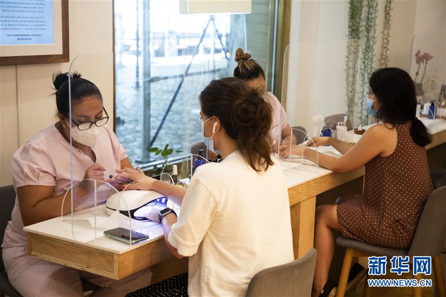 7月6日,技师在美国纽约一家美甲店为顾客美甲。 当天,纽约进入重启第三阶段,美甲店、按摩店等个人护理业在经历近4个月的停业后被允许重新开放。因防疫需要,原本应在第三阶段开放的餐饮业室内就餐仍处于暂停状态。 新华社记者 王迎 摄