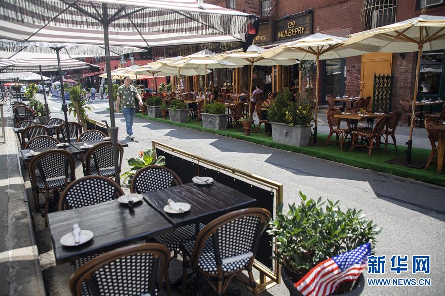 7月6日,一名男子从美国纽约一家餐厅的户外餐区旁经过。 当天,纽约进入重启第三阶段,美甲店、按摩店等个人护理业在经历近4个月的停业后被允许重新开放。因防疫需要,原本应在第三阶段开放的餐饮业室内就餐仍处于暂停状态。 新华社记者 王迎 摄