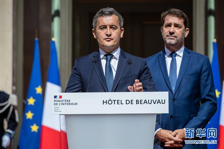 7月7日,在位于法国巴黎的内政部,新任内政部长热拉尔德·达尔马宁(左)在权力交接仪式上致辞。 新华社发(奥雷利安·莫里萨尔 摄)