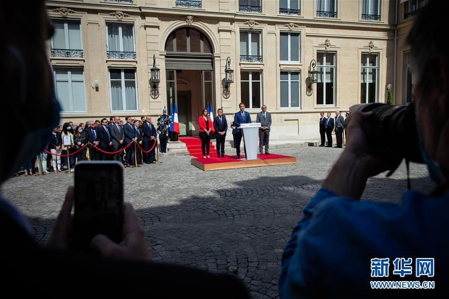 7月7日,在位于法国巴黎的内政部,前内政部长卡斯塔内(中右二)和新任内政部长热拉尔德·达尔马宁(中左二)出席权力交接仪式。 新华社发(奥雷利安·莫里萨尔 摄)