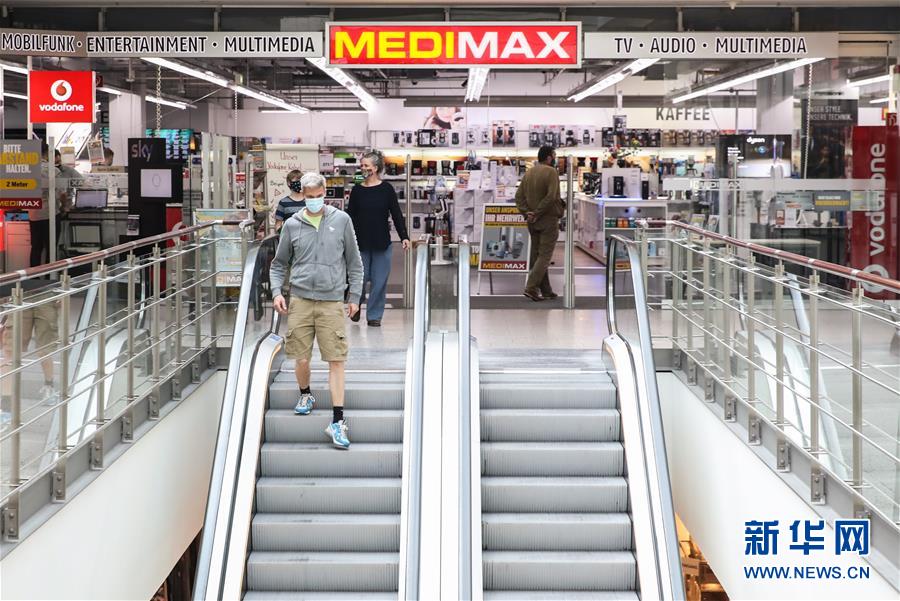 7月7日,佩戴口罩的顾客在德国首都柏林一家购物中心购物。