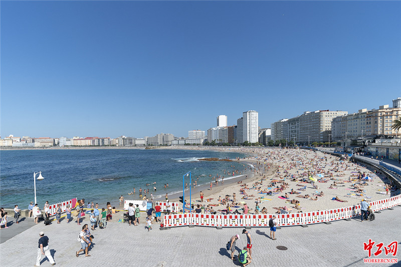 当地时间2020年7月7日,西班牙A Coruna,为控制社交距离,Riazor海滩拱门前设置了红绿灯排队,提示允许或禁止人们进入海滩。图为民众排队等待进入沙滩。
