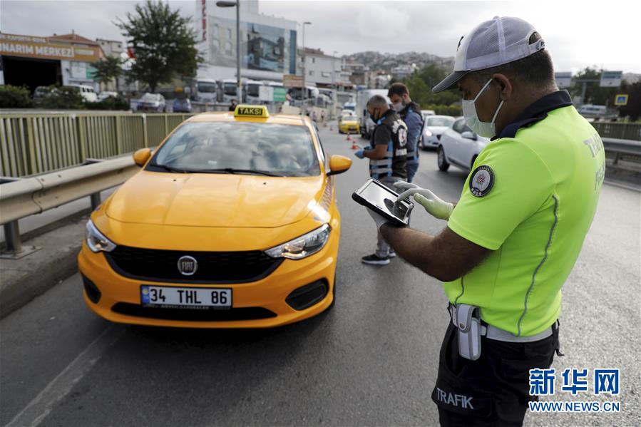 7月8日,一名交警在土耳其伊斯坦布尔检查一辆出租车。 土耳其卫生部长科贾8日在新闻发布会上说,该国当日新增新冠确诊病例1041例,累计确诊208938例。 新华社发(奥斯曼·厄尔萨尔摄)