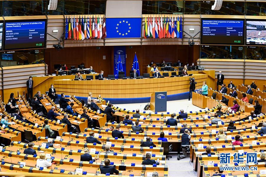 7月8日,德国总理默克尔在比利时布鲁塞尔举行的欧洲议会全会上致辞。 德国总理默克尔8日在欧洲议会发表讲话,阐述德国担任欧盟轮值主席国的工作规划。默克尔强调,欧洲各国必须搁置分歧,找到共同解决方案,这样才能增强凝聚力,变得更强大,最终成功度过当前危机。她说:“这也是我们担任主席国的指导原则。团结一致,让欧洲再次强大。” 新华社发(欧盟供图)