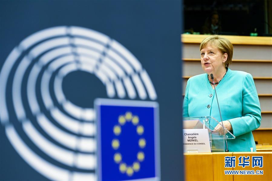 7月8日,德国总理默克尔在比利时布鲁塞尔举行的欧洲议会全会上致辞。 德国总理默克尔8日在欧洲议会发表讲话,阐述德国担任欧盟轮值主席国的工作规划。默克尔强调,欧洲各国必须搁置分歧,找到共同解决方案,这样才能增强凝聚力,变得更强大,最终成功度过当前危机。她说:“这也是我们担任主席国的指导原则。团结一致,让欧洲再次强大。” 新华社发(欧盟供图)
