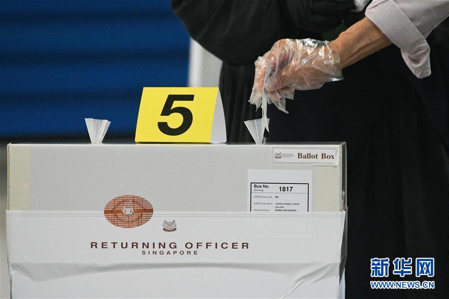 7月10日,一名戴手套的选民在新加坡一处投票站投票。 新加坡当日举行第13届国会选举。 新华社发(邓智炜摄)
