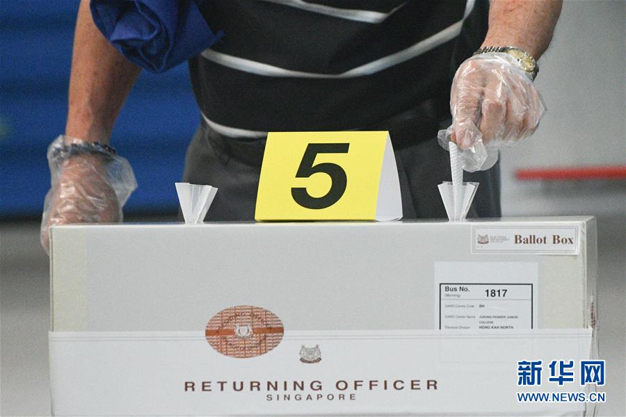 7月10日,戴着手套的新加坡选民在一处投票站投票。 新加坡当日举行第13届国会选举。 新华社发 (邓智炜摄)